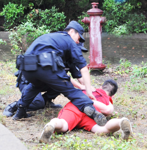 当日下午15:30,防恐演练首先开始。演练场景设置如下:公司大型储备基地门口两名保安正在哨位执勤,突然,在门前游荡的1名男子从随身携带的手提袋中抽出管制器械,冲破保安的阻挡窜入厂区。执勤保安一人跟踪,一人立即启动紧急预案。基地人员迅速集结并入厂区搜索,与此同时,特警紧急响应,与先期入厂搜索人员一起合力将暴徒围在中间,用长警棍和防暴钢叉,将“暴徒”击倒、制服、上手铐、带至前来支援的警车内。整个过程干净利落,用时不超过2分钟。