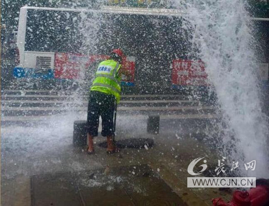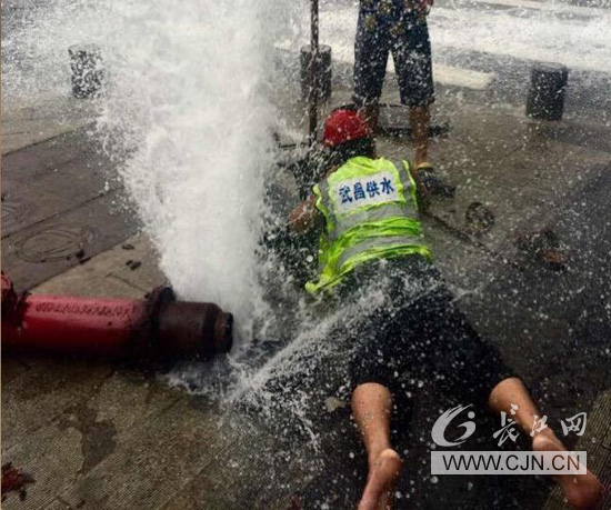 8月3日正午12:35,武昌供水部武昌管线所接热线信息称,尚隆地球村小区门前消火栓被车辆撞断。当抢修人员徐金奎迅速到现场时,被撞断的消火栓已脱离地面,水柱喷射高达3米,形成球面冲顶。