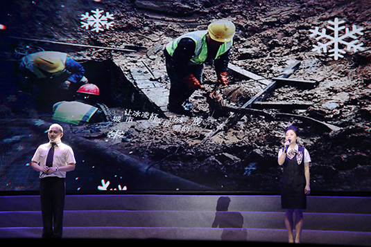 “我如果是雪,怎会让冰棱打造特殊的战场,让城市的血管被残暴的冻伤?但我不是,我只是你的孩子,只能听你说起,在银装素裹里身披雪花的景象,美得像是纯洁的诗行…”,随着水务集团朗读者的娓娓道来,现场观众的思绪被拉回到2018年年初的那场大风雪中,天寒地冻,居民用水告急,水务集团的普通党员们,夜以继日,辛勤不辍,不分分内分外,全力以赴抢修保供。许多职工无暇顾及家中年幼的孩子,长时间奔波在防冻保供的第一线,成了孩子眼中“不合格”的家长。水务集团的原创诗作《我如果是…》,以孩子的视角,再现了冰天雪地里水务集团广大党员干部职工以清新作风保供担当,舍小家为大家,传递暖心“为民情怀”的故事。一幕幕场景、一句句诉说,直击人心,许多人感动的热泪盈眶。?口区纪委领导称赞道:“水务集团创作的节目让我们感动落泪,水务集团作出的贡献让我们深深感谢!”