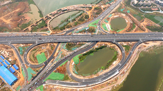 野芷湖立交桥作为连接三环线与南大门的重要交通枢纽,原有的4股上下桥匝道已无法满足日益增加的车流量,成为当地交通的“肠梗阻”。集团公司投资建设的新野芷湖立交桥是其中重要的节点工程,将建成全市第一座分离式集散车道的枢纽立交,其中南北两侧共计4条匝道在改造后将变成南北各4条匝道,同时在三环线上增加帮宽桥,使单侧桥面宽度增加2车道,专门用于分流下行匝道车辆,较好地起到行车疏导作用。