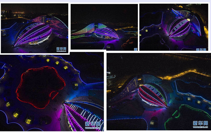 新华网2016年9月25日讯(记者熊琦摄)9月25日,“2016国家网络安全宣传周”将在湖北武汉城投国际博览中心闭幕。9月23日夜晚的国博中心展馆流光溢彩,广迎八方来客。