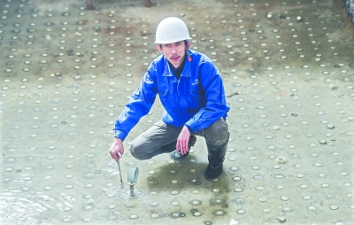 周旭辉检查滤池配气系统 记者许魏巍 摄