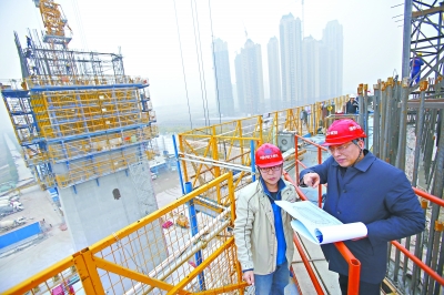 杨泗港长江大桥项目部负责人鲁有月(右)在汉阳主塔墩指挥施工 记者陈卓 摄