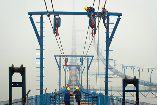 笔者看到,猫道中跨的弧线大概与江面呈30度角,最前面的30米铁网上铺设木板,方便工人施工。此处还看不到脚底下滚滚江水,再往前走就是镂空的铁丝网,踏上去双脚只能缓缓移动,整个人小心翼翼。