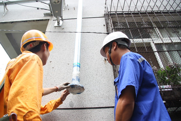 徐清公寓就是典型的老旧社区,今年夏天的时候老姜和老李多次前来“踩点”,因为没有小区的平面图和地下管网图,他们专门为小区丈量测绘。武汉进入三伏天的时候,老姜他们顶着烈日正式入场,打支架、装立管。由于徐清公寓自身没有气源,须借路挖至销品茂寻气源,这无疑又增加了施工难度。