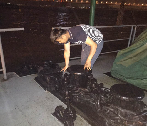 水厂当班人员检查取水船?链及船舱