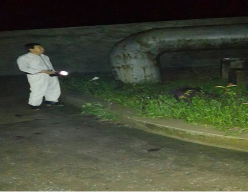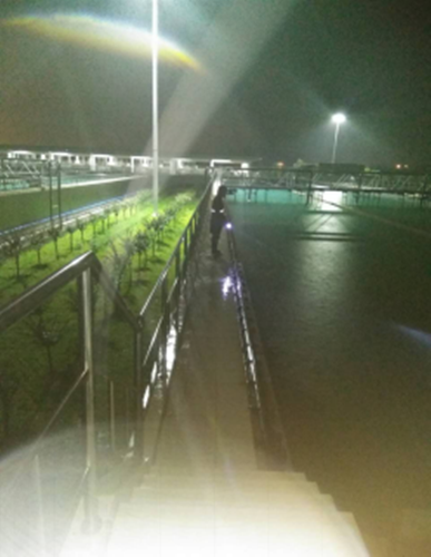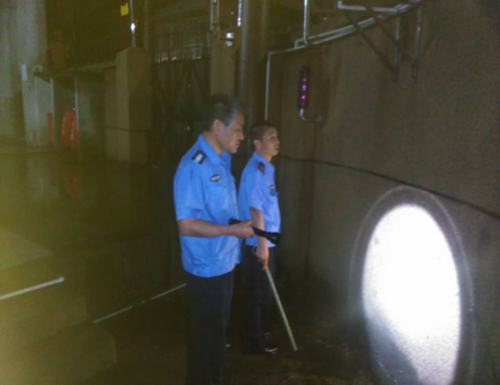 当班人员夜间冒雨巡视沉淀池