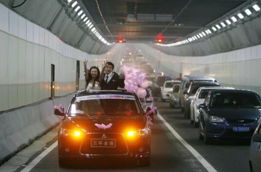 2008年12月28日,武汉长江隧道通车,一对新人途经隧道驶向幸福生活。